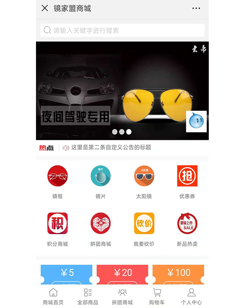 該應用是專為眼鏡愛好者的購物公眾號,設計開發積分商城、拼團、砍價等功能模塊。